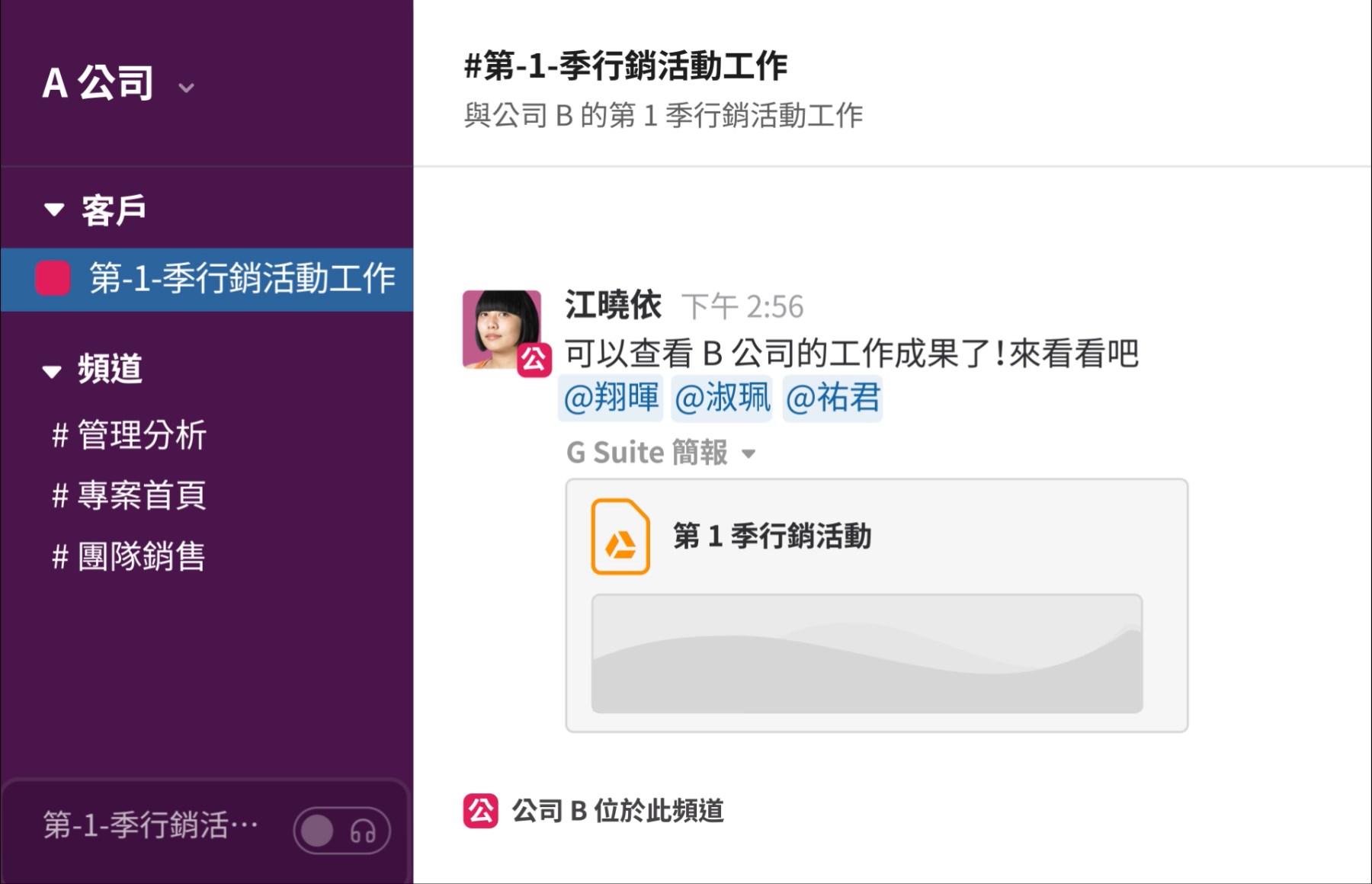 只要使用 Slack Connect (適用於付費方案),直接在 Slack 中就能展開對話,也能改善與合作夥伴、廠商和客戶等對象的溝通方式。
